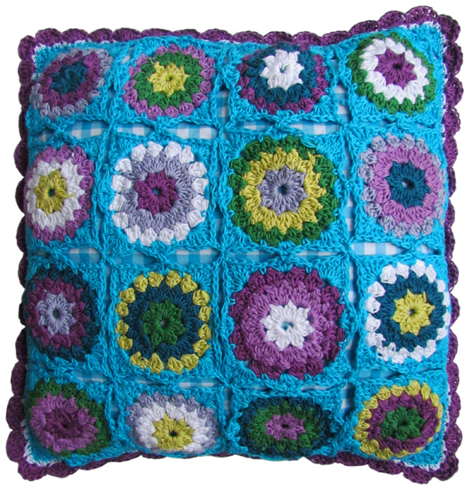 De voorkant gehaakt en de basis van een frisse geruite katoen. Hierop heb ik het gehaakte vierkant met de hand vast genaaid. Helemaal leuk... de achterkant heeft omgehaakt knopen. Maar deze laat ik morgen zien....